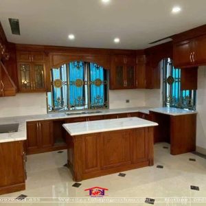 - Khung và tủ: Gỗ tự nhiên – có thể là gỗ căm xe hoặc gỗ sồi, được xử lý chống mối mọt và sơn phủ PU màu nâu cánh gián.