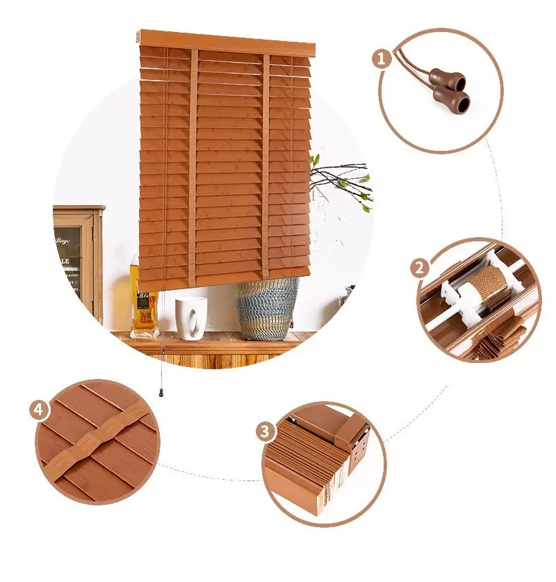 - Màn gỗ nhựa PS: những lá nhựa giả gỗ bản 50mm làm từ Polystyrene bền dẻo, có 2 loại dây thang để lựa chọn là: dây sợi nhỏ, và dây đai 25mm. Màn kéo bằng dây và xoay lá bằng dây xoay, các dây này có nhiều màu sắc có thể phối với rèm theo từng sở thích.