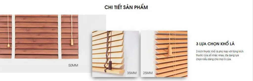 - Màn sáo gỗ Star Blinds có 3 khổ lá: để giúp phù hợp với mỗi kích thước ô cửa sổ, chúng tôi đã sản xuất ra 3 khổ lá khác nhau, 25mm, 35mm và 50mm.