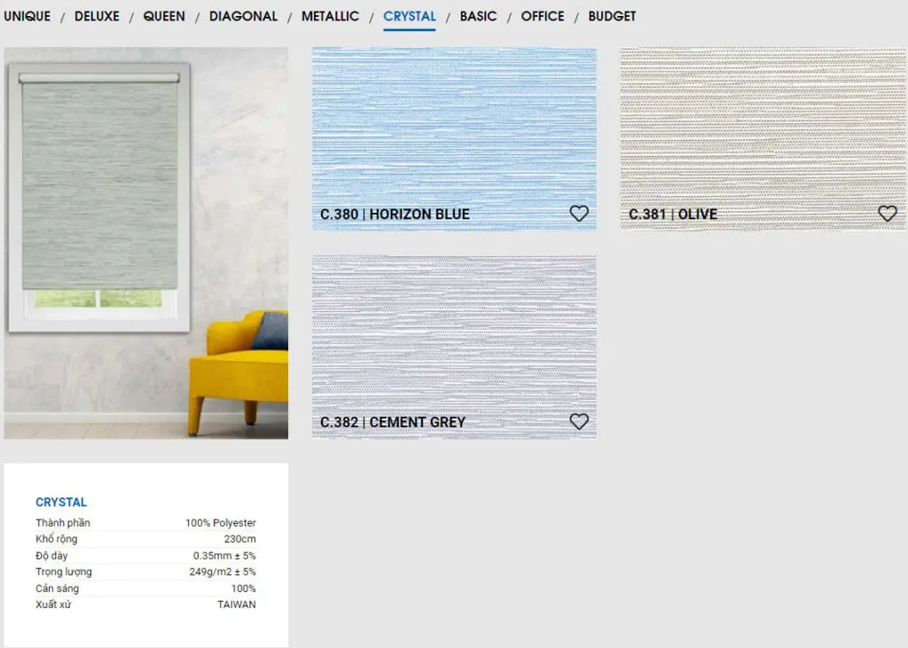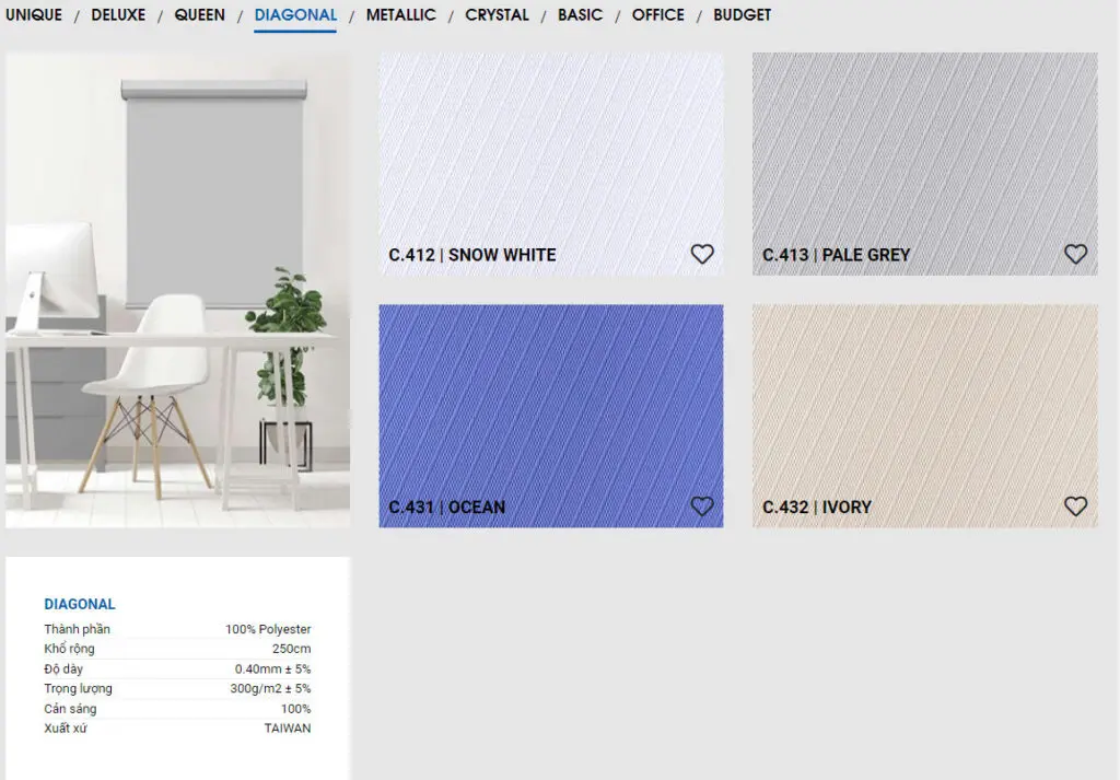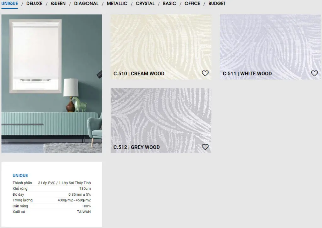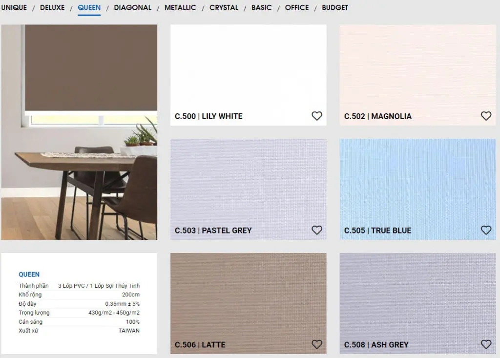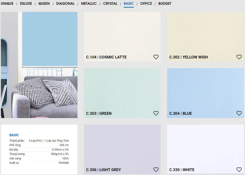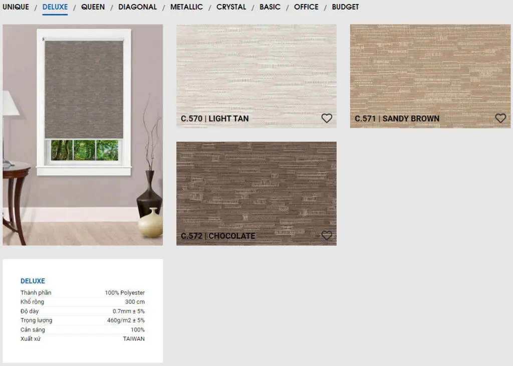 - Được giới thiệu bằng catalogue đi kèm hình ảnh, chất liệu sản phẩm, với 90+ mẫu màu sắc và chất liệu khác nhau.