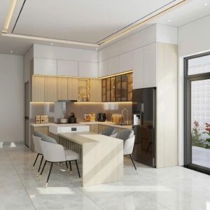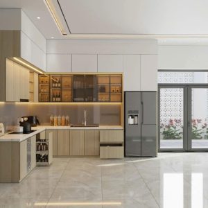 Phòng Bếp “Nắng Nhẹ” – Gỗ Sáng & Kính Đồng Tinh Tế
