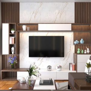 Phòng Khách Gỗ Óc Chó Tối Màu & Đá Vân Mây Tối Giản
