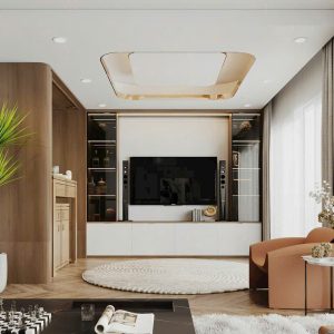 Phòng Khách Sắc Mộc Caramel – Dấu Ấn Đương Đại Trên Nền Gỗ và Ánh Kim