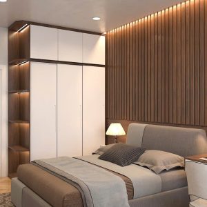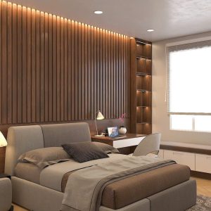 Phòng Ngủ “Trầm Mộc Sang Trọng” – Gỗ Óc Chó & Đèn Âm Ấm Cúng