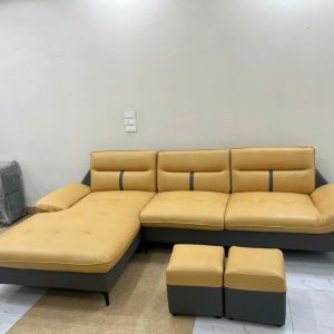 Sofa Góc L Da PU Vàng – Chân Sắt Đen, Tựa Rút Nổi 4 Khối