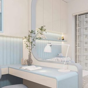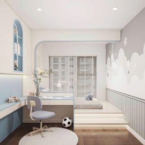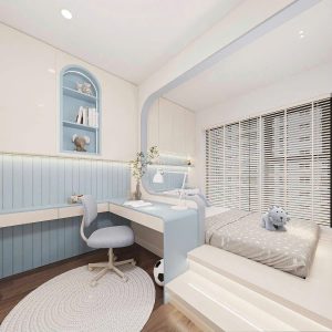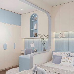 Phòng Ngủ Bé Trai Tông Trắng Xanh Tích Hợp Bàn Học Và Tủ Âm Tường Uốn Vòm