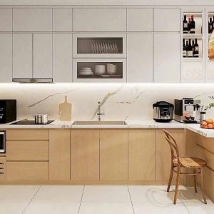 - Mặt bếp: Đá nhân tạo hoặc đá quartz màu trắng kem.