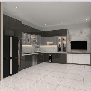 Tủ Bếp Chữ L Gỗ Óc Chó Cánh Trắng Xám Tối Giản