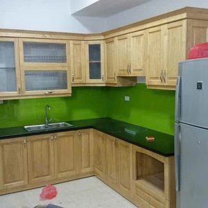 Tủ Bếp Gỗ Sồi Tự Nhiên Chữ L – Kính Xanh Lá Mát Mắt