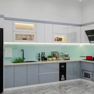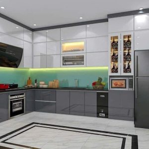 Tủ Bếp Hiện Đại Tông Xám Kính Ốp Sáng Nhẹ