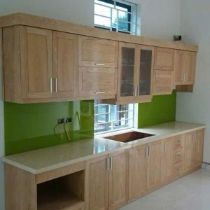 Tủ Bếp Gỗ Sồi Tự Nhiên Chữ L – Kính Xanh Lá Mát Mắt