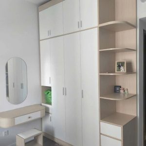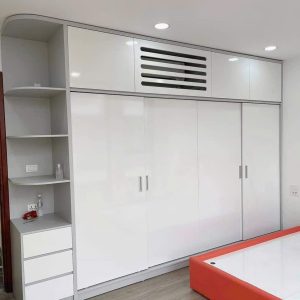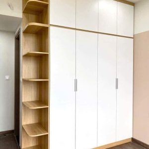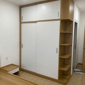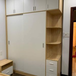 - Tông màu: Trắng phối vân gỗ sồi nhạt tự nhiên, tạo cảm giác sáng sủa và ấm cúng cho phòng ngủ.