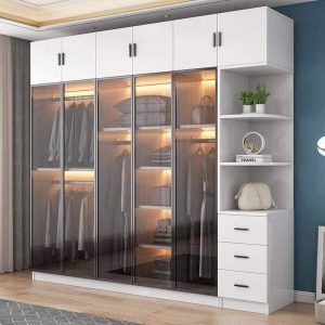 Tủ Quần Áo Gỗ MDF Cửa Kính Cường Lực Dáng Thẳng Kịch Trần Kèm Kệ Trang Trí Và Hộc Kéo