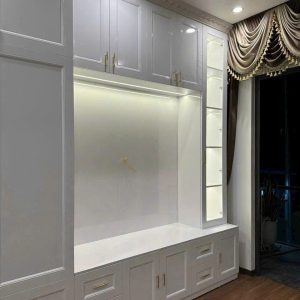 Tủ Quần Áo Gỗ MDF Sơn Bóng Cổ Điển & Kệ Tivi Trung Tâm Tích Hợp Tủ Kính LED